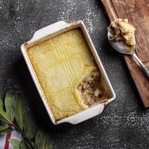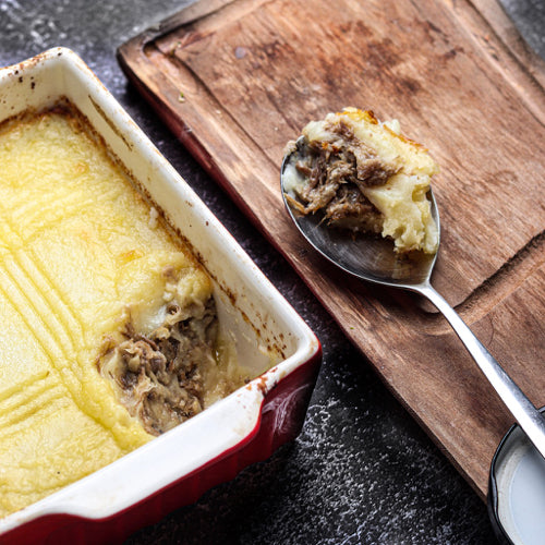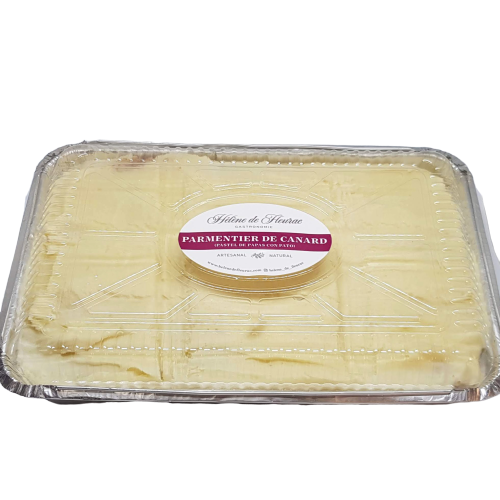 Un rico plato preparado para compartir: un puré de papas hecha con grasa de pato y un pino de pato. Es un receta francesa única a servir con una lechuga por ejemplo.